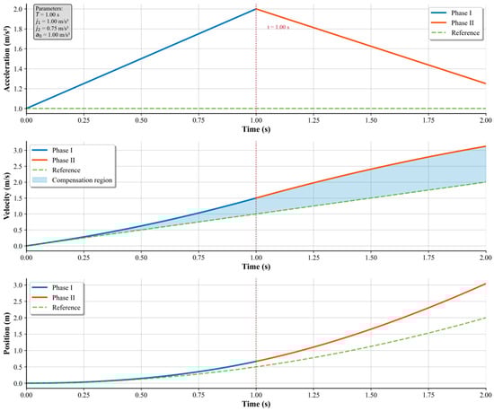 Phase 1: Acceleration Phase (). During the first phase, the vehicle applies an additional positive correction acceleration superimposed on its nominal acceleration :