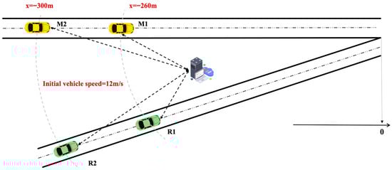 The traditional approach to managing ramp merging operations has relied primarily on infrastructure-based solutions such as ramp metering systems, variable speed limits, and geometric design improvements [,]. While these methods have shown some effectiveness in regulating traffic flow, they operate at a macroscopic level and cannot address the fundamental microscopic interactions between individual vehicles that cause merging conflicts. Moreover, these conventional strategies are largely reactive, responding to traffic conditions after problems have already manifested, rather than proactively preventing conflicts through coordinated vehicle control.