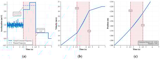 To simultaneously compensate for position and velocity errors within a finite correction period , we propose a two-stage correction mechanism. The correction time is divided into two equal stages of duration , with different correction accelerations and applied in each stage, as shown in Figure 3. The correction process begins from the vehicle’s current nominal trajectory state at correction initiation: (position), (velocity), and (acceleration).