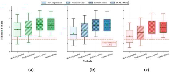 Boxplots of minimum TTC distributions. (a) Low. (b) Medium. (c) High.