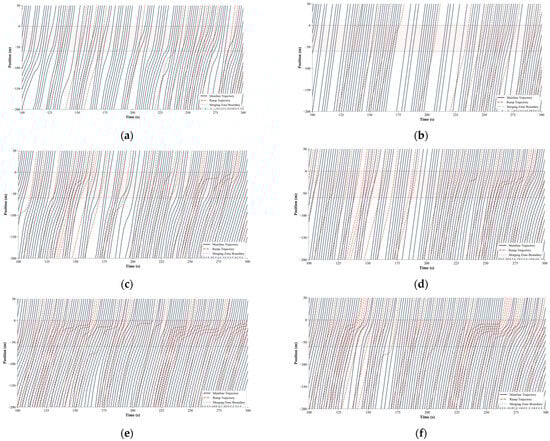 Vehicle trajectories under different traffic densities. (a) Low volume of base, (b) low volume of DCMC, (c) medium volume of base, (d) medium volume of DCMC, (e) high volume of base, and (f) high volume of DCMC.
