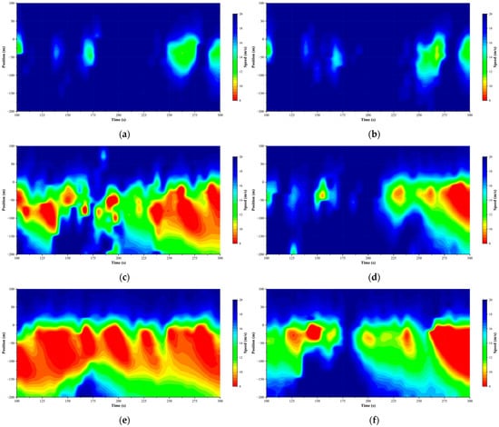 Speed heatmaps under different traffic densities. (a) Low volume of base, (b) low volume of DCMC, (c) medium volume of base, (d) medium volume of DCMC, (e) high volume of base, and (f) high volume of DCMC.
