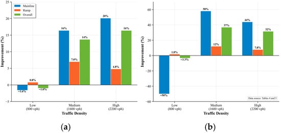 To visualize the simulated traffic conditions, we recorded the speed and position of each vehicle within the control zone (400 m upstream to 100 m downstream of the merging point) at each 0.1 s timestep. Figure 11 presents the vehicle trajectories, where black solid lines indicate mainline vehicles and red dashed lines represent ramp vehicles. These trajectory plots reveal traffic flow patterns, merging coordination phenomena, and disturbance propagation characteristics under different control strategies and density levels. Figure 12 displays speed heatmaps generated by collecting cross-sectional vehicle speeds at 50 m intervals throughout the simulation period. These contour plots visualize the spatiotemporal distribution of speeds, revealing congestion formation, shockwave propagation, and the effectiveness of speed harmonization strategies. The color gradient ranges from red (low speeds below 10 m/s) through yellow (medium speeds 12–16 m/s) to green (high speeds above 18 m/s). Table 3 and Table 4 present the quantitative performance metrics for travel time and delay, respectively, including total average values, mainline-specific, and ramp-specific measurements for each scenario. The tables also show the percentage improvement achieved by cooperative control compared to the base case. Figure 13 visualizes these improvements across traffic densities, clearly illustrating how benefits scale with congestion levels.