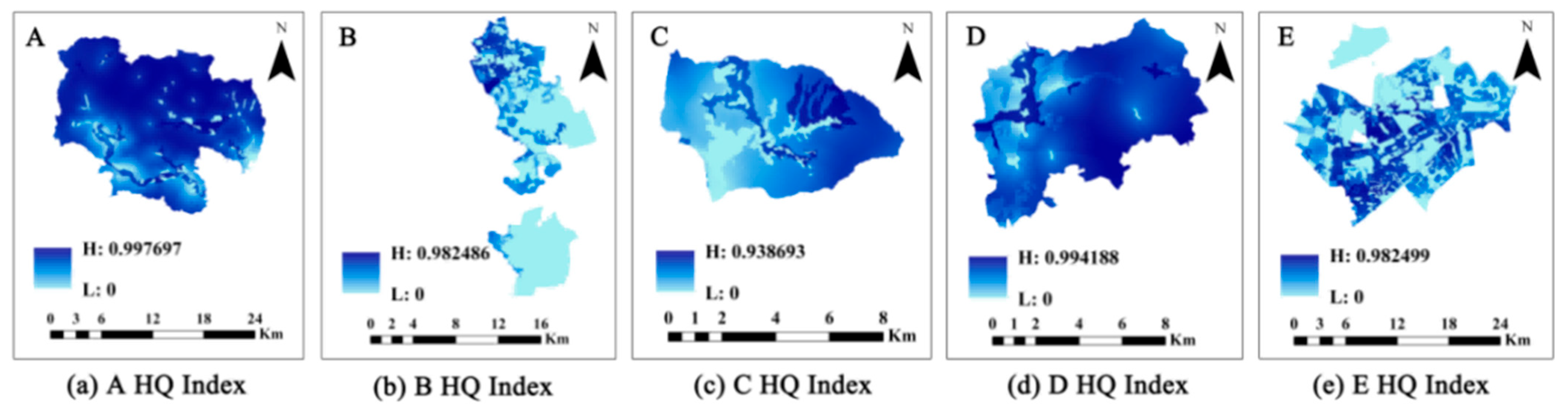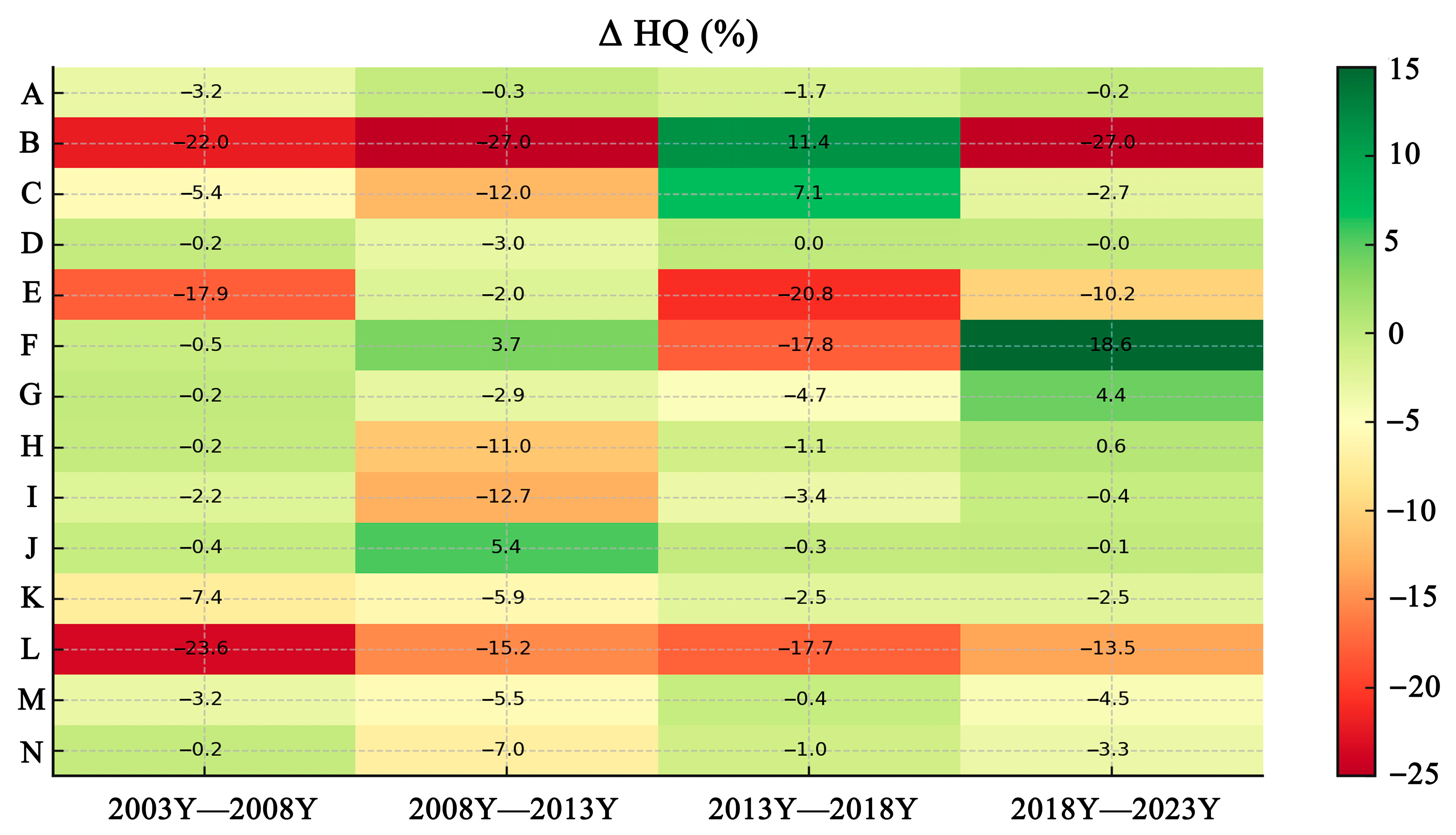 3.2.3. Temporal Changes in HQ of the 14 Agricultural Heritage Systems