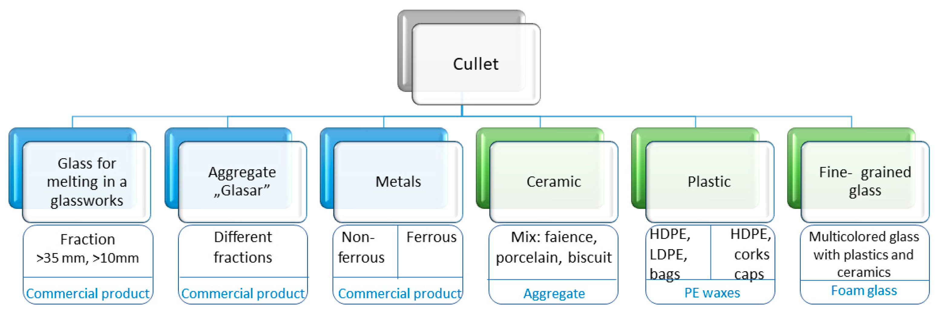 - Barbato, P.M.; Olsson, E.; Rigamonti, L. Quality degradation in glass recycling: Substitutability model proposal. Waste Manag. 2024, 182, 124–131. [Google Scholar] [CrossRef] [PubMed]