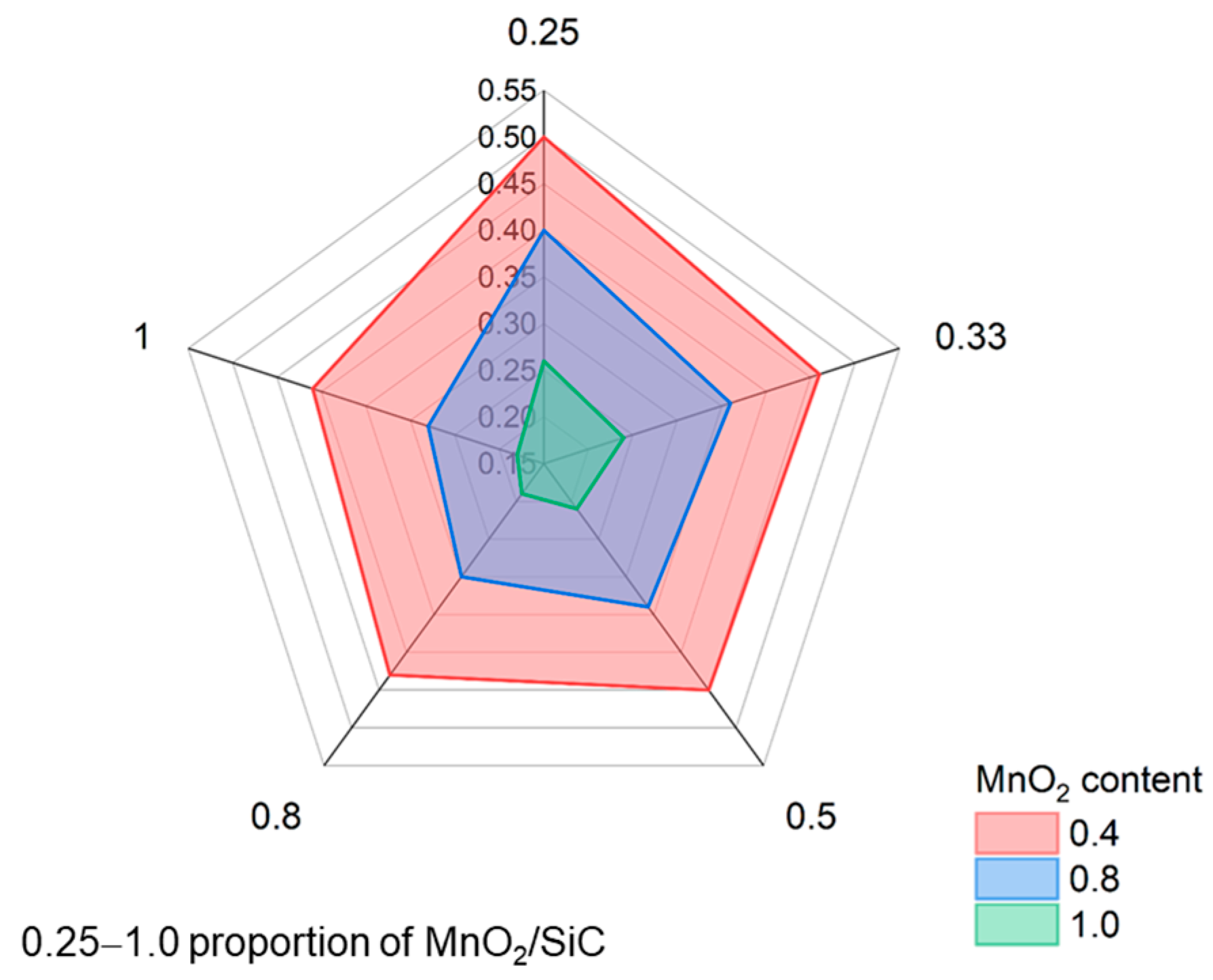 - MnO2/SiC weight ratio—5 levels: 0.25, 0.33, 0.5, 0.8, and 1.0;
