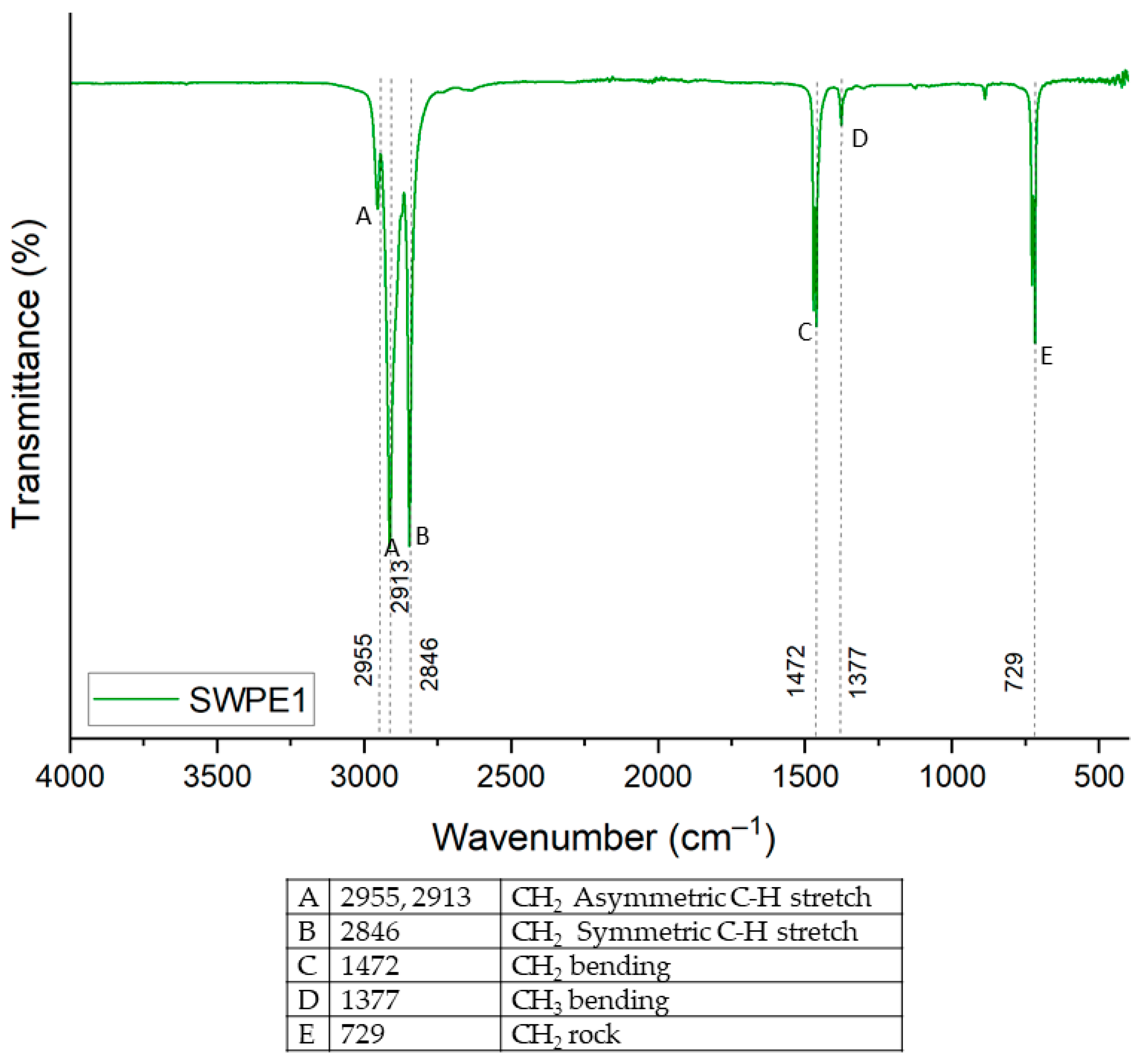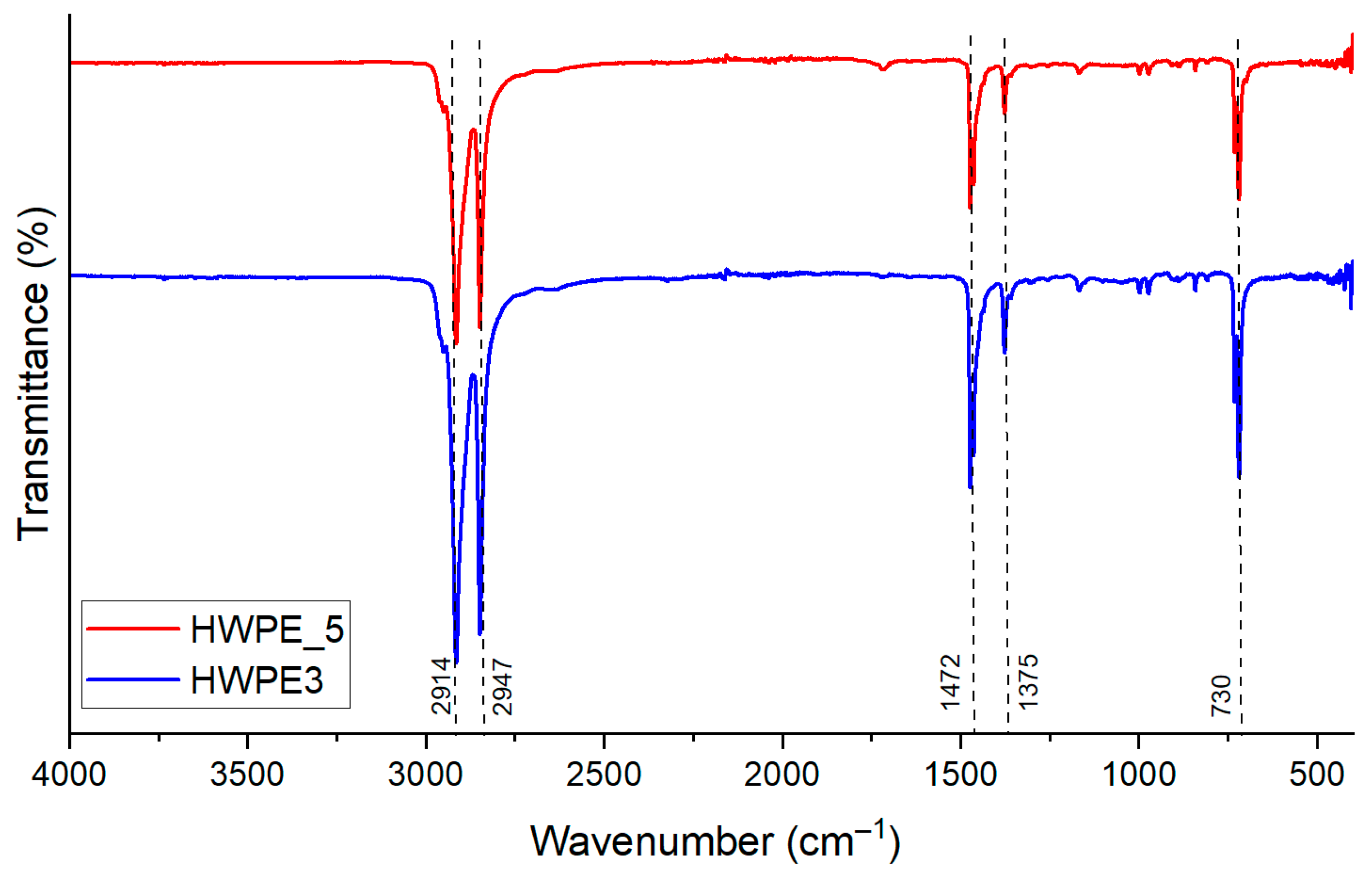 - ATR-FT-IR Spectrum of Polyethylene Wax (4000–225 cm−1). Available online: https://spectra.chem.ut.ee/paint/binders/polyethylene-wax/ (accessed on 29 May 2025).