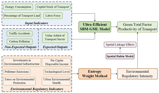 Environmental regulation (ER) is an important initiative to promote the green transformation of the transportation industry. It refers to mandatory constraints with environmental protection as the goal, individuals or organizations as the target, and institutions or awareness as the expression, which aim to guide and regulate behavior to reduce negative impacts on the natural environment [6]. In the area of transportation, the government, through optimizing the system, restructuring the rules of resource allocation, implementing economic instruments and policy guidance, and other initiatives, has formed institutional pressure on transportation enterprises, prompting enterprises to adjust their production functions, actively invest in intelligent transportation technology innovation, improve energy efficiency, and effectively reduce air pollutant emissions, achieving the transformation from traditional extensive development to green and low-carbon production modes [7,8,9]. In order to satisfy the increasingly stringent environmental protection requirements and enhance their competitiveness, enterprises have to increase the investment in environmentally friendly innovations, carry the green development concept through all segments of production and operation, and promote the green upgrading of the structure of the transportation industry [10,11]. The public forms a positive feedback mechanism for the green transformation of the transportation industry through green consumption choices and environmental awareness [12]. The synergistic effect of these multi-party bodies from the government, enterprises, and the public promotes the continuous evolution of the production function of the transportation industry in the direction of environmental friendliness, steadily improves the GTFP of the transportation industry, and ultimately realizes the green transformation of the transportation industry, laying a solid foundation for the realization of the ‘dual-carbon’ goal [13].