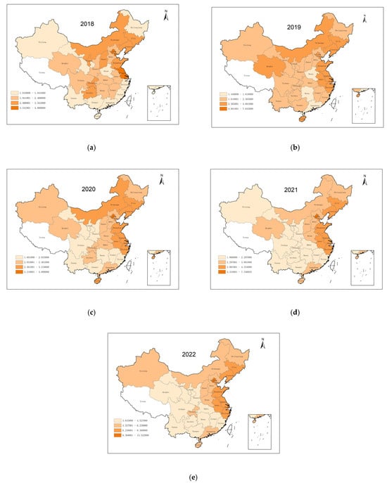 This study evaluates the static GTFP of transportation across 30 provinces in China from 2018 to 2022. The analysis employs the Super SBM model, which incorporates non-desired outputs into the evaluation. To gain deeper insights into regional disparities in the green level of transportation, the study applies the natural breakpoint method to classify the results of the assessment, which allows us to determine the natural grouping of the data by minimizing the variance within each category and maximizing the variance between categories [48]. A visual representation of the regional division is shown in Table 5, where the provinces are divided into intervals.