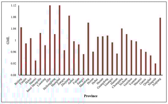The analysis reveals that the GML index of GTFP in 30 provincial administrative regions across the country exhibited fluctuations during the period from 2018 to 2022. As illustrated in Figure 4, the national average GML index is 0.98, reflecting a slight downward trend in the dynamic GTFP of transportation over the study period. This is due to the significant impact of the outbreak of the epidemic on the transportation industry at the end of 2019 [51]. In particular, the implementation of traffic control measures, coupled with a slowdown in economic activity, led to a substantial reduction in both freight and passenger demand. This, in turn, directly affected transportation demand and efficiency, thereby influencing the technological advancement and technical efficiency within the transportation system. In comparison, there is generally significant growth in 2022 due to the relaxation of traffic control measures, a gradual recovery in economic activity, and a rejuvenation of the transportation industry.