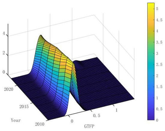 Kernel density estimates of China’s GTFP from 2010 to 2023.