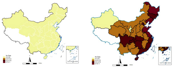 In addition, this study employs visualized maps to analyze the spatial distribution characteristics of green total factor productivity (GTFP) across China. The results, as illustrated in Figure 2, demonstrate a substantial improvement in GTFP nationwide from 2010 to 2023, corroborating the upward trend identified by the kernel density estimation analysis. Notably, GTFP in the eastern region is markedly higher than that in the central and western regions. The comparatively elevated GTFP observed in the eastern region can be attributed to several key factors. First, the eastern provinces possess a more advanced economic structure and higher levels of industrial modernization, which facilitate the adoption of green technologies and promote efficient resource allocation. Second, this region benefits from more developed infrastructure, greater innovation capacity, and stronger integration into international markets, all of which are conducive to improvements in green total factor productivity. Third, stricter environmental regulations and heightened public environmental awareness further incentivize enterprises in the east to enhance their green production efficiency. By contrast, the central and western regions tend to be more reliant on resource- and energy-intensive industries, and continue to face constraints such as limited technological capacity, lower levels of human capital, and weaker market mechanisms. These structural challenges contribute to the relatively lower levels of GTFP observed in these regions.