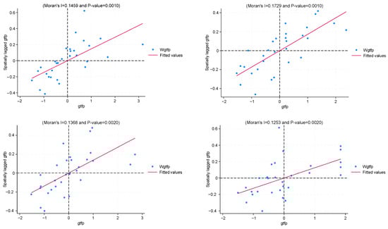 We further examine the local Moran’s I statistics for China’s green total factor productivity (GTFP) in the years 2010, 2014, 2019, and 2023. The results, as depicted in Figure 3, reveal that the local Moran’s I values are predominantly distributed within the first and third quadrants. This pattern indicates that China’s GTFP mainly exhibits “high-high” and “low-low” spatial clustering characteristics. In other words, provinces with high GTFP levels tend to be geographically clustered with other high-performing provinces, creating positive spatial spillover effects. Conversely, provinces with low GTFP levels are typically surrounded by similarly underperforming neighbors, which reinforces the persistence of local low-efficiency traps. These spatial clustering patterns underscore the combined effects of regional disparities in economic development, heterogeneity in technological innovation capacities, and variations in the stringency of environmental regulations across different provinces. Consequently, these findings highlight an urgent need for the central government to advance coordinated regional green development policies, strengthen mechanisms for interregional technology diffusion, and provide targeted support for capacity building in lagging areas. Such measures are essential for alleviating spatial inequalities in green total factor productivity and fostering more balanced and sustainable national development.