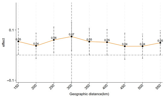 In spatial econometric analysis, decomposing the estimated effects into direct and indirect (spillover) components is essential for elucidating the mechanisms through which explanatory variables influence the dependent variable across space. Unlike conventional regression models, spatial econometric models explicitly account for spatial interactions, whereby a change in an explanatory variable in one region can affect not only outcomes within the same region (direct effect) but also outcomes in neighboring regions (indirect or spillover effect). The direct effect measures the average impact of a unit change in an explanatory variable on the dependent variable within the focal spatial unit, incorporating feedback effects attributable to spatial dependence. By contrast, the indirect effect quantifies the extent to which changes in an explanatory variable in one region are transmitted through the spatial structure to influence outcomes in other regions. The total effect is defined as the sum of the direct and indirect effects, thus capturing the comprehensive impact of the explanatory variable across the entire spatial system. The results are reported in Table 5. It can be observed that both the estimated direct and indirect effects are statistically significant, further corroborating the existence of spatial spillover effects associated with logistics industry clustering. These findings provide additional empirical support for Hypothesis 4, underscoring the necessity of accounting for both local and interregional interactions when evaluating the determinants of green total factor productivity.