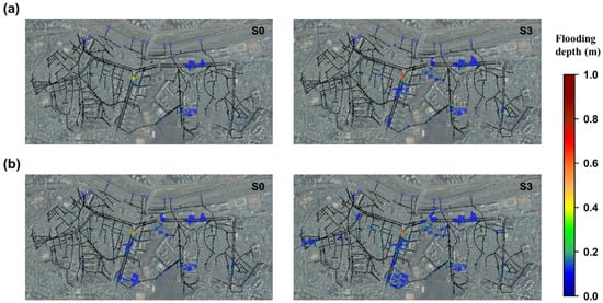 Flood-inundation maps of the FG drainage network for the extreme rainfall events of (a) 2010 and (b) 2011, comparing the results between baseline (S0) and highest-ranked scenario (S3). Black lines indicate the layout of pipes within the UDN. Color shading indicates flood depth categories, where red represents higher flood depths (i.e., higher flood risk level) and blue represents lower flood depths (i.e., lower flood risk level).