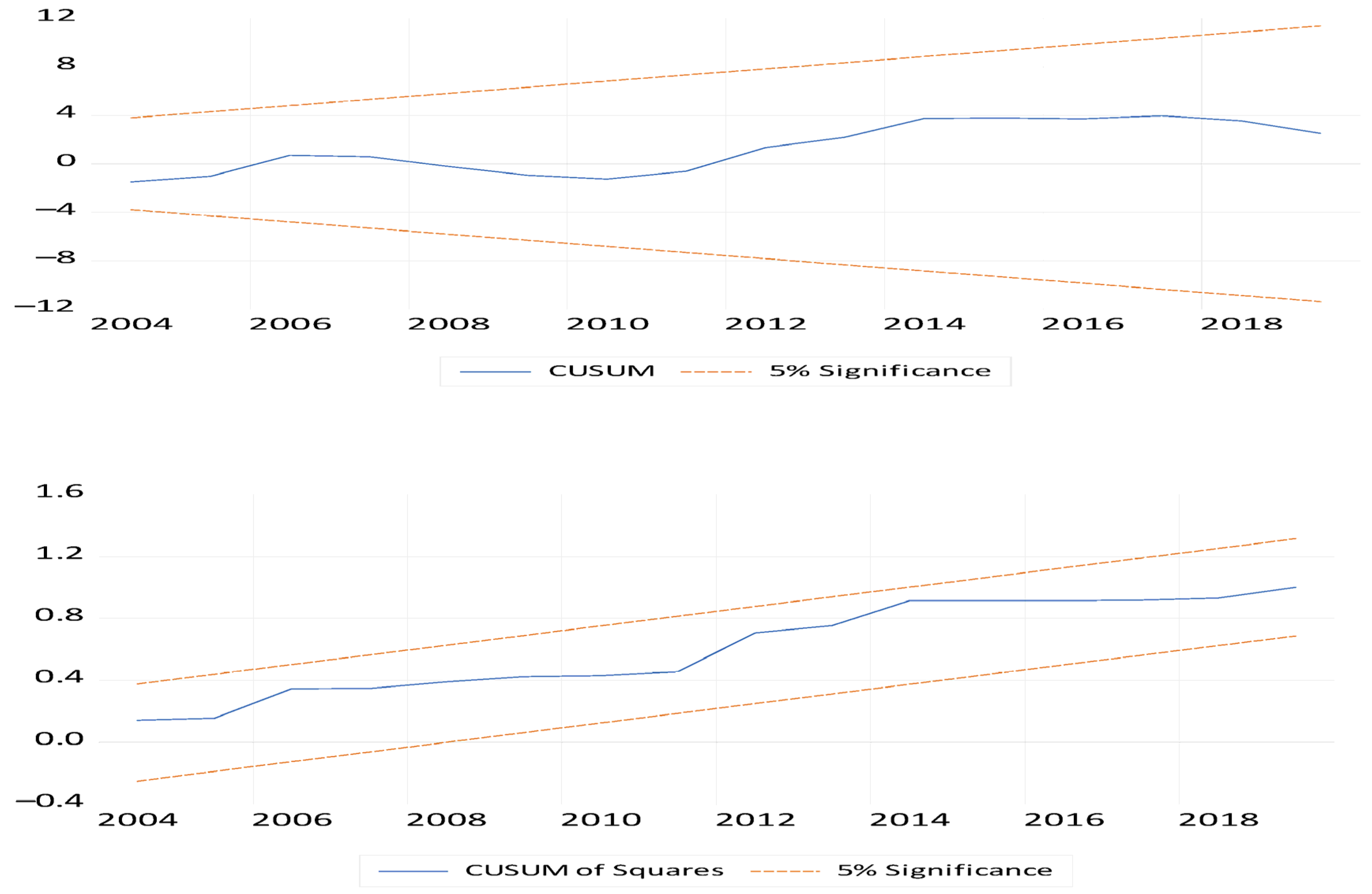 55]. These structural challenges have contributed to the marginalization of agriculture within Türkiye’s growth process, which in turn explains the long-run negative effect of GDP on virtual land trade through both production and trade channels.
