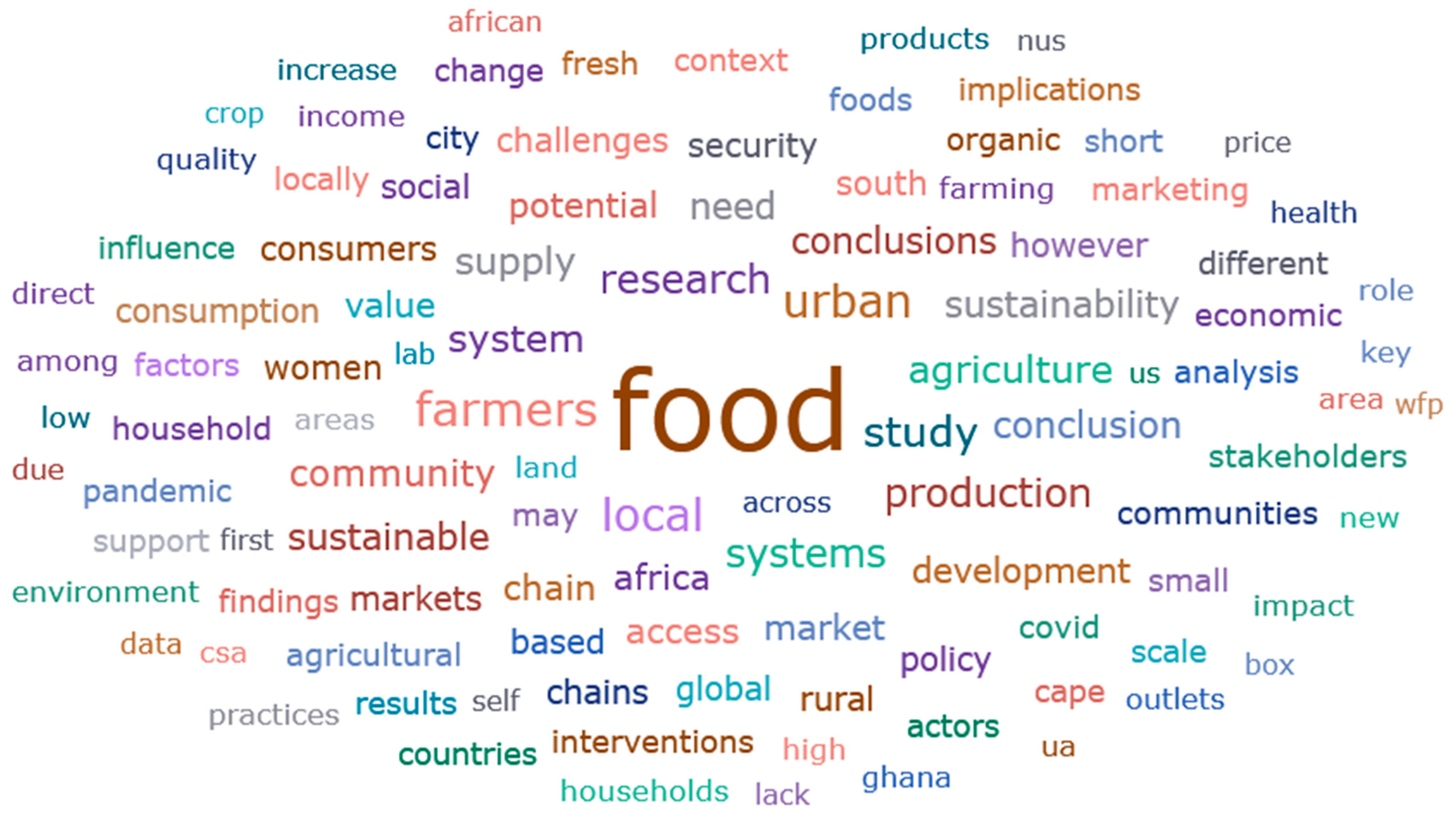 | Urban and Local Food Systems | City, community, local, local food, neighbourhood, proximity, short supply, urban. | [28,29,30,31,32,33,34] | 68 | 99% |