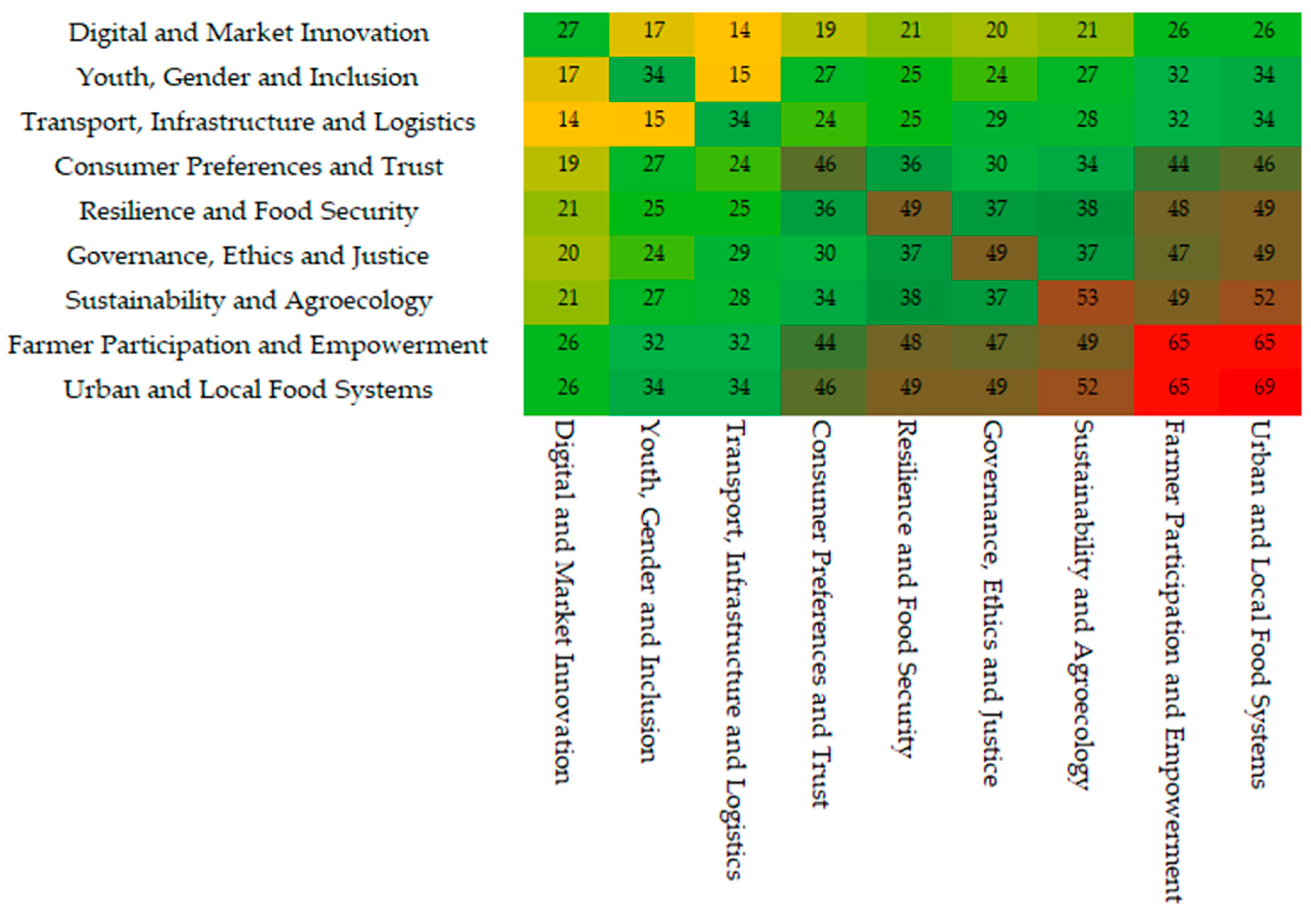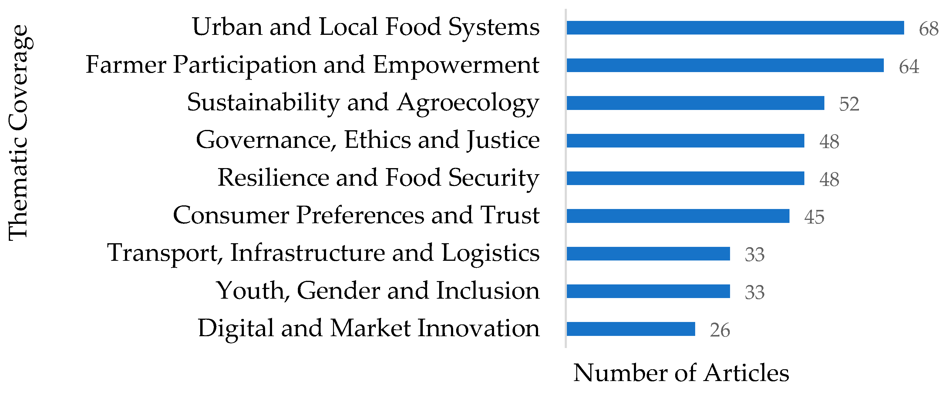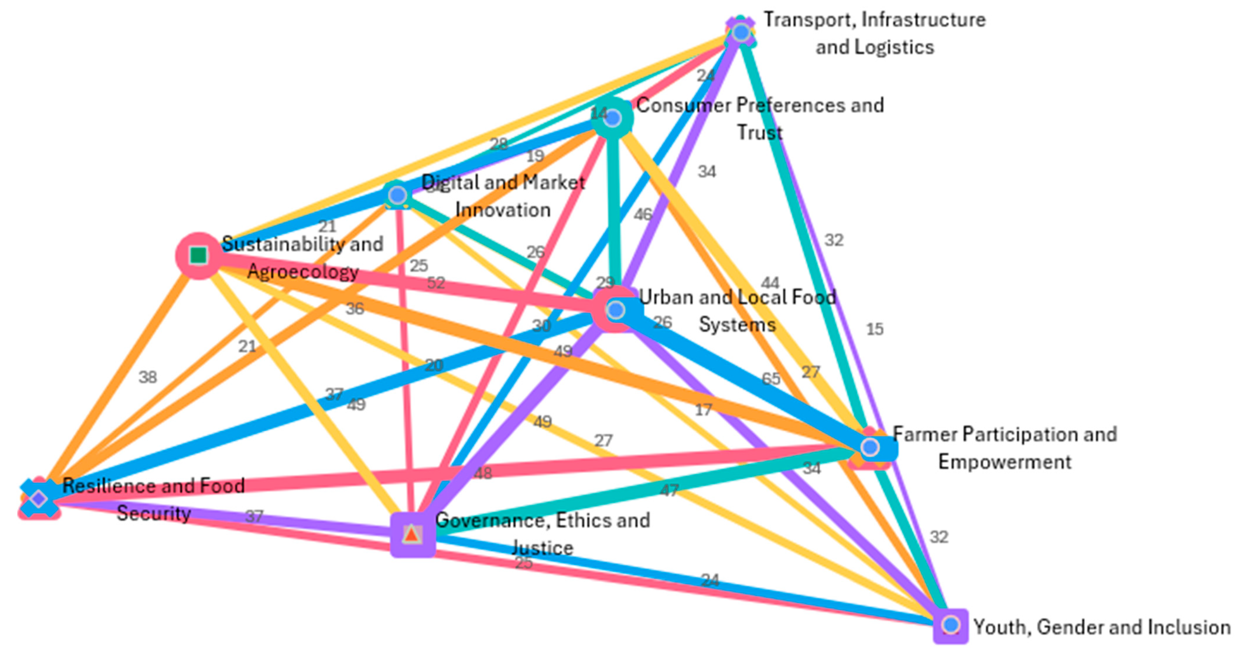 | Urbanisation and Participation | Urban and Local Food Systems; Farmer Participation and Empowerment; Consumer Preferences and Trust. | Visual triangular core with strong co-occurrence edges (Urban–Farmer = 65, Urban–Consumer = 46, Farmer–Consumer = 43). Reflection of SFSCs’ social dynamics (consumer behaviour, local production, and empowerment) Central in both structure and conceptual logic. |