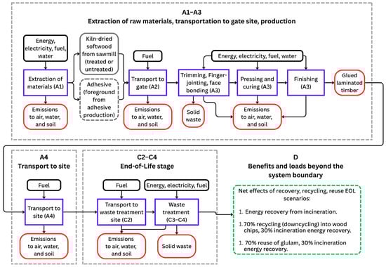 - Puettmann, M.; Oneil, E.; Johnson, L. Cradle to Gate Life Cycle Assessment of Glue-Laminated Timbers Productions from the Southeast; CORRIM Report; 2013; Available online: https://corrim.org/wp-content/uploads/2018/06/SE-Glulam-LCA-report-1_7_13-final.pdf (accessed on 28 August 2025).