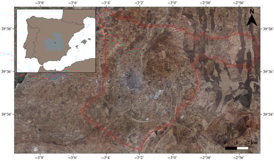 According to the Geological and Mining Institute of Spain [49], the geological substratum of the area comprises formations from the Mesozoic and Cenozoic eras. The Mesozoic is represented by Jurassic micritic, oolitic, and bioclastic limestones and Lower Cretaceous detrital deposits. The Cenozoic succession includes both Paleogene and Neogene materials, which are part of the marginal facies of the Madrid Basin. These deposits reflect the basin’s evolution from the Paleogene through the lower Neogene, indicating a continuous sedimentary record across these periods. The surface geology is dominated by Cenozoic sediments, primarily composed of continental detrital facies (conglomerates, sands, silts, and clays), forming a gently undulating plain typical of the southern Iberian sub-plateau. These deposits are associated with fluvial and lacustrine environments and are largely responsible for the current geomorphology of the area. The region shows little recent tectonic activity, although it retains structures inherited from Alpine orogenic phases.