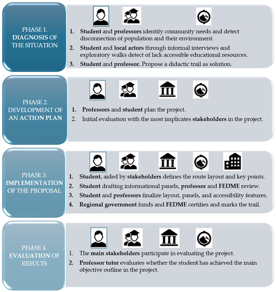 Each participant had specific responsibilities that contributed to the overall success (Figure 2). The student played a central role, being primarily responsible for the design and implementation of the trail in all phases of the project, especially from 1 (diagnosis) to 3 (implementation). As such, the university tutor and the other faculty professor not only collaborated during the design and implementation phases but also supervised the student’s academic work, monitored their progress, and formally evaluated the project to ensure that the APS objectives were met through the development of the trail. The role of the engineering professor has also been key in monitoring the project, especially in the more technical aspects such as layout and cartography. The final outcome of the work was assessed and formally graded by an academic committee composed of faculty members from the Faculty of Education.