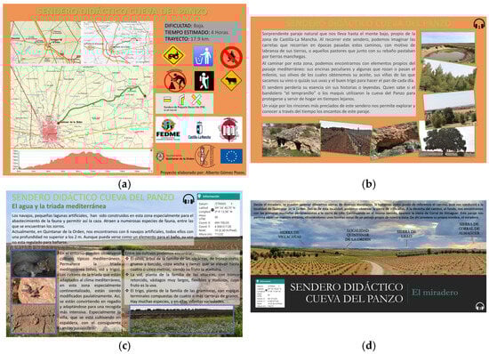 The educational proposal (see the table in Section 3) was carried out in accordance with the content and competencies established by the regional regulations in effect at the time of writing this work [53]. The contents and skills in the subject of Geography are aimed at the second cycle of primary education (3rd and 4th grades; 8–10-year-olds). In the development of the proposal, it has been considered that teaching in trails implies the study of environmental, social, economic, and cultural dimensions. The panels were also cognitively adapted for individuals with diverse disabilities, with the student receiving support from local disability associations. Alternative and augmentative communication systems have been developed and evaluated to enhance the cognitive accessibility of the trail. Specifically, the panels include Braille, pictographic symbols, easy-to-read formats, and audio guides. Their design follows the principles of universal design for learning (UDL) [53] and is framed within the broader concept of Universal Accessibility. According to Alonso [54], this approach considers individuals with diverse characteristics and abilities, aiming to address a wide range of educational needs. Finally, the student, with the help of the municipal technician—who also funded the report certifying the safety of the trail—prepared a technical report including the materials generated during the project, with the aim of having it approved by the regional government. After presenting and defending it, the report was approved for the trail to be signposted.