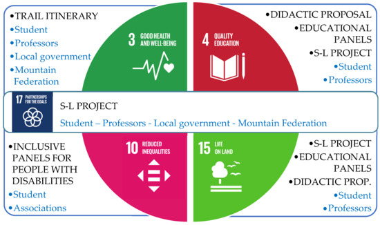 In this context, S-L is closely aligned with SDG 17 of the 2030 Agenda [19], which seeks to strengthen partnerships among governments, the private sector, academia, and civil society to ensure that no one is left behind in the path toward sustainable development. Specifically, the trail initiative contributes to Target 17.17 [19], which focuses on encouraging and promoting effective partnerships in public, public–private, and civil society spheres, leveraging the experiences and resource strategies of these collaborations. At the same time, this approach contributes directly to other key SDGs: SDG 3 (Good Health and Well-being), by promoting physical activity and emotional well-being through engagement with nature; SDG 4 (Quality Education), by offering inclusive and experiential learning opportunities; and SDG 10 (Reduced Inequalities), by integrating accessibility measures that ensure all individuals—regardless of their abilities—can participate equally and also SDG 15 (Live on land). Thus, the trail and its S-L framework become a multidimensional tool that strengthens education, equity, health, and collaboration in alignment with the 2030 Agenda.