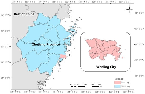 Wenling City is situated along the southeastern coast of Zhejiang Province, China (121°09′50″ E–121°44′0″ E, 28°12′45″ N–28°32′02″ N), covering a land area of 1073.6 km2. Figure 1 shows the location of Wenling City. With a population of approximately 1.44 million, the city achieved a regional GDP of 141.7 billion CNY in 2024. Its economic structure is characterized by a tertiary sector ratio of 7.1:43.6:49.3 (primary:secondary:tertiary), with pillar industries, including the pump and motor sector, automotive/motorcycle sector, footwear/apparel sector, and machine tool sector.