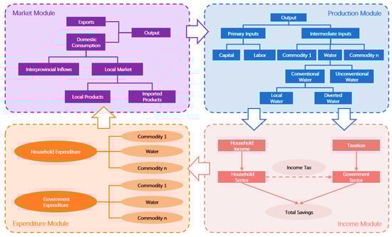 To comprehensively model the intricate relationships between water use behaviors and economic activities, this study extends the CGE model with a water resource module, with the enhanced framework illustrated in Figure 2. Traditional CGE models treat water merely as a single sector and commodity, failing to reflect differentiated water-source-specific supply and demand responses to economic policies [23]. Addressing this gap, this study employs a nested Constant Elasticity of Substitution (CES) production function structure to systematically reflect substitution relationships among distinct water sources.