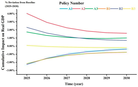 Among combined policies, policy A3 achieves sustained cumulative employment growth through policy synergy, reaching a cumulative growth of 4.1% by 2025 and maintaining a positive cumulative increase of 1.38% by 2030. Conversely, policy B3 exhibits mild cumulative growth characteristics, starting with a cumulative growth of 1.2% by 2025 but gradually slowing to a cumulative growth of 0.39% by 2030, reflecting how the offsetting effects of taxation and subsidies weaken overall policy impact.