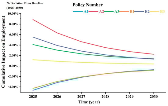For taxation policies, policy A1 exerts sustained negative pressure on employment, with a cumulative decline of −4.64% by 2025. However, as industrial transformation progresses, this cumulative adverse effect gradually weakens, narrowing to −0.7% by 2030. Similarly, policy B1 results in a relatively moderate cumulative employment suppression effect of −4.27% by 2025, though the downward trend persists until the end of the policy cycle with a cumulative decline of −0.81% by 2030.