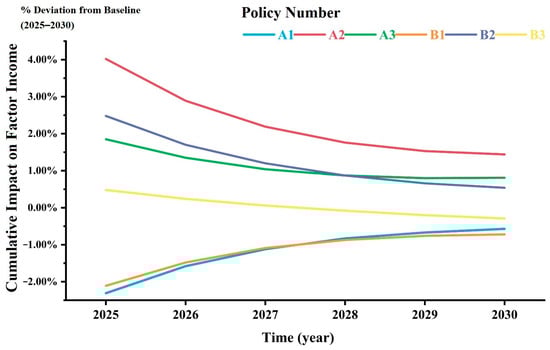 For taxation policies, policy A1 initially exerts significant negative pressure, reducing factor income by 2.31% in 2025. However, this adverse effect gradually diminishes—reaching −0.57% by 2030—as industrial transformation and technological substitution take effect. In contrast, policy B1 shows more persistent suppression, with factor income declining from −2.11% in 2025 to −0.72% in 2030, reflecting long-term drag effects from sectoral contraction.