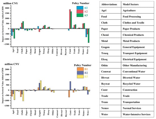 For taxation policies, policy A1 results in substantial reductions in value added for targeted sectors such as agriculture (CNY −6.68 billion) and food processing (CNY −0.76 billion), while non-water-intensive sectors like apparel/footwear (CNY +1.64 billion) and construction (CNY −1.59 billion) show divergent responses, reflecting direct regulatory effects on water efficiency. Within policy B1, apparel/footwear (CNY −6.39 billion) and construction (CNY −6.76 billion) experience significant declines, though paper/printing (CNY +0.38 billion) grows despite not being directly restricted.