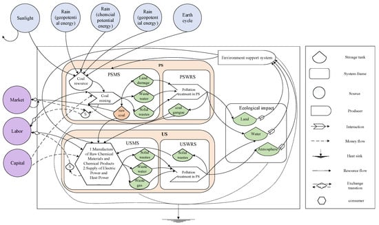 37]. The emergence of this theory provides crucial theoretical support for a deeper understanding and optimization of the interactions among natural resource utilization, economic development, and ecological conservation. This study constructs an emergy analysis diagram for the operation process of the coal industry (