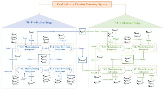 Figure 1). The operation process mainly consists of two parts: (1) Internal energy flow. During the coal production stage, natural resources are converted into raw coal to supply the utilization phase. The manufacturing subsystem serves as the primary driver of material and energy flows within the coal industry’s circular economy system, while the waste recycling subsystem acts as a crucial bridge, facilitating energy exchanges between the manufacturing subsystem and the ecological environment. (2) Energy transfer between internal flows and the external environment. The natural ecosystem provides essential resources, environmental support, and ecological functions for the operation of the coal industry’s circular economy, while the socio-economic system contributes key inputs such as materials, energy, and capital. Throughout this process, dynamic exchanges occur between coal production, utilization, and waste recycling and the external environment. These interactions not only enhance resource efficiency but also generate substantial economic, social, and environmental benefits.