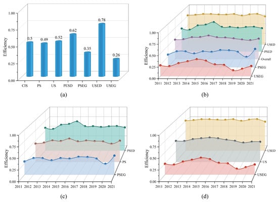 Figure 3b shows the changing trends of the overall efficiency of the circular economy and the efficiency of each subsystem, showing a fluctuation pattern of “first reduction-then expansion-then reduction”. This trend reflects the three stages of circular economic development: transformation period, strengthening period, and rising period.