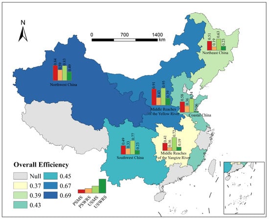 Figure 4 illustrates that the circular economy efficiency scores of the coal industry in the Northwest and the middle reaches of the Yellow River are the highest, 0.69 and 0.67, respectively. However, the waste recycling efficiency in the middle reaches of the Yellow River is lower than that in the Northwest, but the manufacturing efficiency is higher than that in the Northwest. The main reason is that the middle reaches of the Yellow River have the largest coal development base in China, and advanced coal mining and utilization technologies have improved manufacturing efficiency. However, long-term high-intensity and intensive resource exploitation have made it difficult for waste to be effectively and timely treated, resulting in reduced recycling efficiency. In contrast, the Northwest has a relatively fragile ecological background and stricter environmental supervision, which makes waste recycling efficiency higher. The circular economy efficiency of the coal industry in the southwest and coastal regions is close to and at a medium level, with efficiency values of 0.454 and 0.434, respectively. The manufacturing efficiency in the production stage in the southwest is lower than that in the coastal regions, while the waste reuse efficiency in the coal utilization stage in the coastal regions is extremely low. The main reason is that coal mining in the southwest is difficult, the regional economic foundation is relatively weak, and capital investment is insufficient, but the manufacturing efficiency is backward. The proportion of high-energy-consuming industries in the coastal regions is large, which has intensified the use of coal, but the efforts to deal with the generated waste are still insufficient. The circular economy efficiency of the coal industry in the northeast and the middle reaches of the Yangtze River is the lowest, at 0.39 and 0.37, respectively. The main reason for the low values in the two regions is that the waste reuse efficiency in the production stage is significantly lower than that in other regions. In addition, the subsystem efficiencies in the utilization stage of the two regions are heterogeneous. The manufacturing efficiency in the middle reaches of the Yangtze River is higher than that in the northeast, but the waste reuse efficiency is lower. The reason is that although the coal utilization technology in the middle reaches of the Yangtze River is relatively advanced, due to the single industrial structure, there is a lack of diversified reuse channels for waste. As China’s old industrial base, Northeast China has low manufacturing efficiency due to slowing economic development, but environmental supervision and relatively rich waste utilization channels have led to a high efficiency in waste recycling.