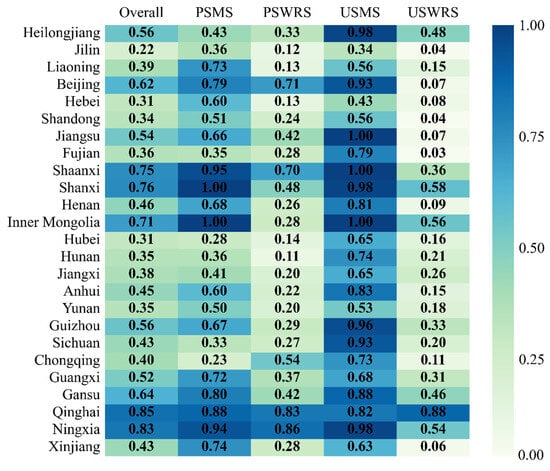 Figure 5 illustrates the overall circular economy efficiency and the efficiency characteristics at different stages of the coal industry across various provinces in China. The study reveals that the overall circular economy efficiency in Shaanxi, Shanxi, Inner Mongolia, Qinghai, and Ningxia all exceed 0.70, ranking among the highest nationwide. Although the differences in overall circular economy efficiency among these provinces are relatively small, there are notable disparities in efficiency between the production and utilization stages. Notably, Qinghai ranks first with an efficiency score of 0.85, exhibiting a high degree of balance across all subsystem efficiencies. This can be primarily attributed to the synchronized development of coal production and utilization processes in the province. Furthermore, as a key ecological conservation region, Qinghai enforces stringent regulations on coal mining approvals and waste management, which have significantly contributed to its well-balanced and high overall circular economy efficiency. In contrast, although Shanxi is China’s most important coal-producing province, the overall efficiency of its coal industry’s circular economy is only 0.760, mainly due to the low efficiency of waste reuse in the production and utilization stages, which are only 0.48 and 0.56, respectively, nearly half lower than that of Qinghai Province. This shows that although Shanxi has achieved intelligent mining of more than 50% of its coal production capacity, making its manufacturing efficiency in coal mining and utilization stages reach the forefront of the industry, the overall circular economy efficiency has not yet reached the optimal level due to the low efficiency of waste reuse. In addition, although Shanxi has implemented a series of waste treatment measures, the implementation strength and governance effect of these measures have not yet met expectations due to the large scale of waste in the coal industry. Therefore, further strengthening waste governance and improving waste reuse efficiency are still crucial to promoting the high-quality development of the circular economy in Shanxi’s coal industry. The overall circular economy efficiency of the coal industry in Jilin, Hebei, Shandong, and Hubei is lower than 0.35. Among the four provinces, Hubei, which has a smaller scale of coal mining, has significantly lower manufacturing and waste recycling efficiency in the production stage than in the utilization stage. This shows that the inefficiency in the production stage is the main factor restricting the circular economy of the coal industry. This can be alleviated by increasing the import of coal from other provinces, continuing to expand and improve the coal supply chain, and using the Yangtze River ports to establish a coal reserve base.