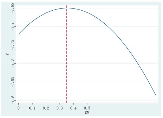 The synergy between government and market mechanisms in green governance can effectively leverage the “visible hand” of the government and the “invisible hand” of the market to drive CGI, thereby enhancing the willingness of firms to implement such innovations. However, excessive collaboration between government and market in green governance may suppress the intrinsic motivation for CGI, leading to diminishing marginal effects. This phenomenon of institutional fatigue has received theoretical support within the field of economics. For instance, grounded in the theory of government regulatory failure, North [19] posits that when external regulations become overly complex, the growth rate of supervision and compliance costs can exceed the marginal benefits derived from coordination. Additionally, the resource-based view suggests that over-reliance on government resources may crowd out the development of firms’ internal innovation absorption capabilities, thereby undermining the motivation for green innovation [57]. Consequently, when the degree of government–market synergy exceeds a critical threshold, firms may become overly dependent on government and market regulatory and evaluative functions, resulting in a loss of intrinsic motivation to engage in green innovation activities. This decline in environmental responsibility awareness may further diminish the enthusiasm for green innovation, leading to a decrease in the marginal effects of the coupling and coordinated development of government–market green governance on CGI. For example, when the proportion of government subsidies allocated to a firm’s green investments exceeds a certain threshold, the firm tends to rely on technology acquisition and equipment purchases to obtain the subsidies, rather than engaging in independent research and development. This phenomenon results in “subsidy dependence” and “crowding out of R&D” [58]. Reliance on end-of-pipe governance technologies or external technology acquisition over a prolonged period may cause firms to adopt fixed technological trajectories. This diminishes their motivation for exploratory green learning and ultimately inhibits breakthrough green innovations [59]. Therefore, we propose a “critical point” hypothesis: