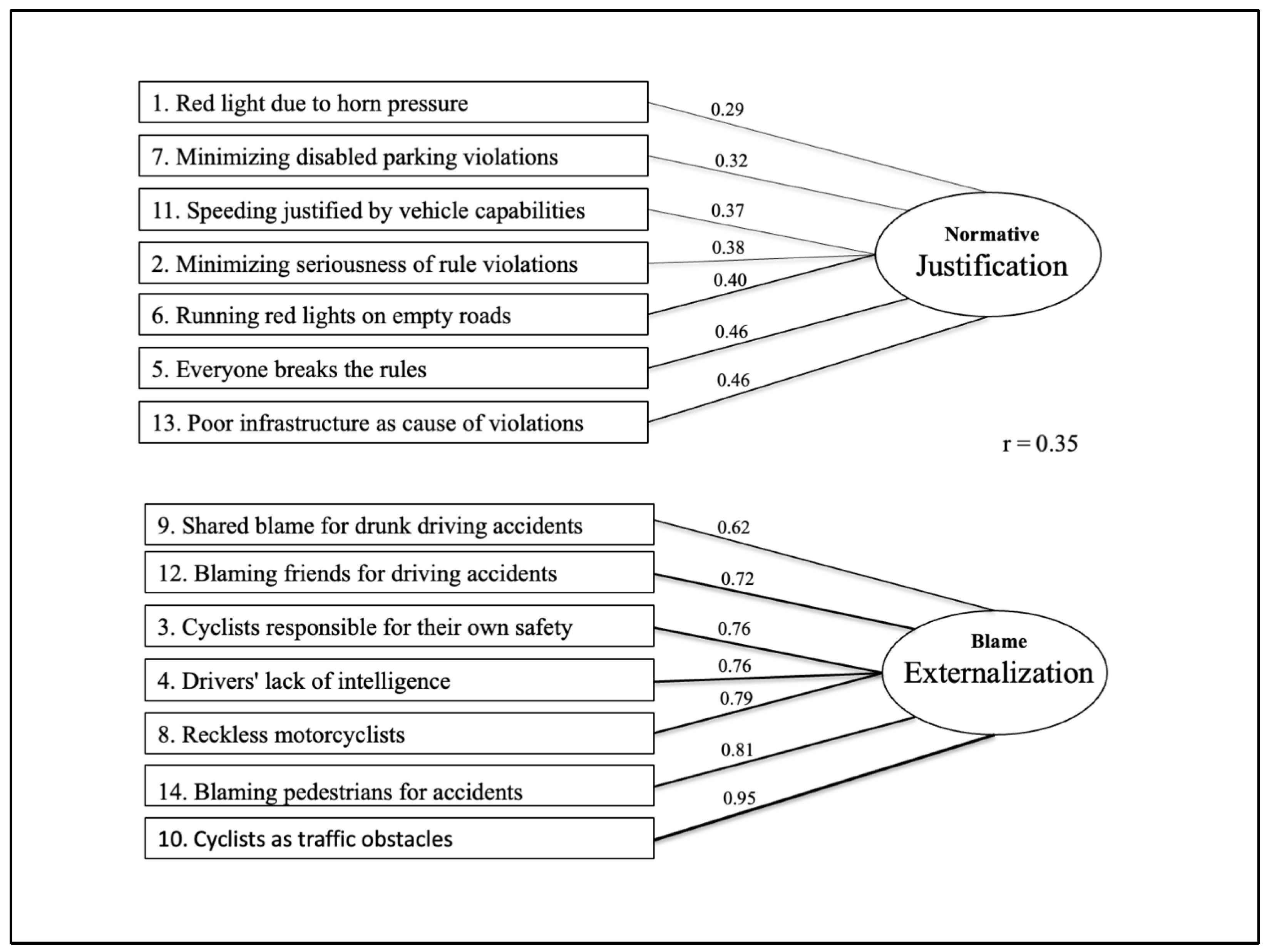 - Factor 1: Normative Justification of Transgressive Driving (Normative Justification), representing cognitive mechanisms that normalize or morally justify risky driving behavior.