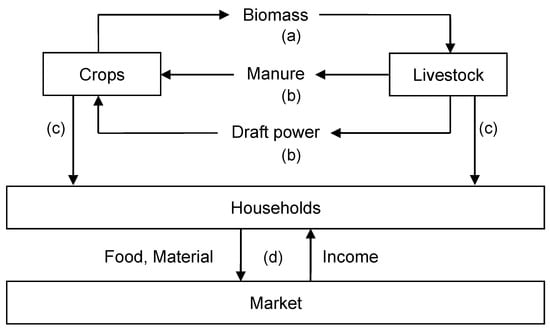 Interactions in a mixed crop–livestock system. (a) Crops provide crop residues, or biomass including nutrients, to livestock, (b) Livestock provide manure and draft power to crops, (c) Households use part of the crop and livestock products for their own consumption, and (d) Households channel the surplus of the crop and livestock products to local markets, and obtain cash income. Source: Modified from [15].
