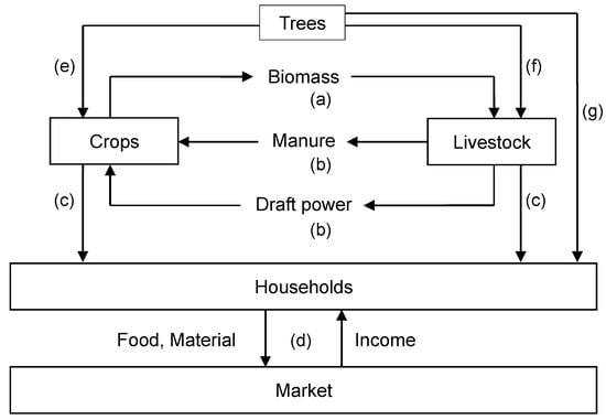 Interactions in an expanded mixed crop–livestock system. (a) Crops provide crop residues, or biomass including nutrients, to livestock, (b) Livestock provide manure and draft power to crops, (c) Households use part of the crop and livestock products for their own consumption, (d) Households channel the surplus of the crop, livestock and tree products to local markets, and obtain cash income, (e) Trees can provide environmental services such as soil fertility improvement, erosion control, and water table stabilization that are conducive to crop growing, (f) Fodder trees, in particular, play an important role for livestock during drought periods, and (g) Trees can provide materials and foods such as firewood, timber and fruits. Source: modified from [15].