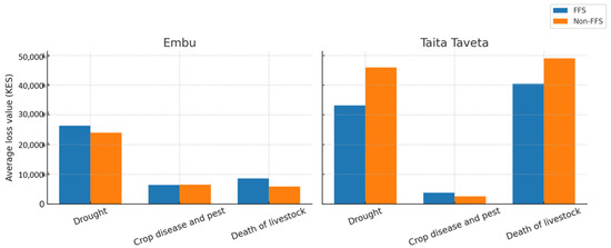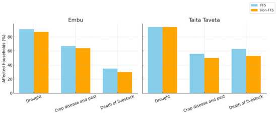Figure 3 and Figure 4 indicate that there is no statistically significant difference in the impact of drought and other adverse events between FFS and non-FFS households; both groups experienced significant hardship. Notably, households in Taita Taveta were more severely affected than those in Embu, largely due to substantially lower annual precipitation. Moreover, the average household income in Taita Taveta (12,543 KES) is significantly lower than that in Embu (16,588 KES), with the difference being statistically significant at the 1% level. This suggests that adverse events exert a more pronounced negative effect on livelihoods in Taita Taveta. In certain cases—such as the impacts of drought and livestock losses in Embu—FFS households appear to have been more severely affected.