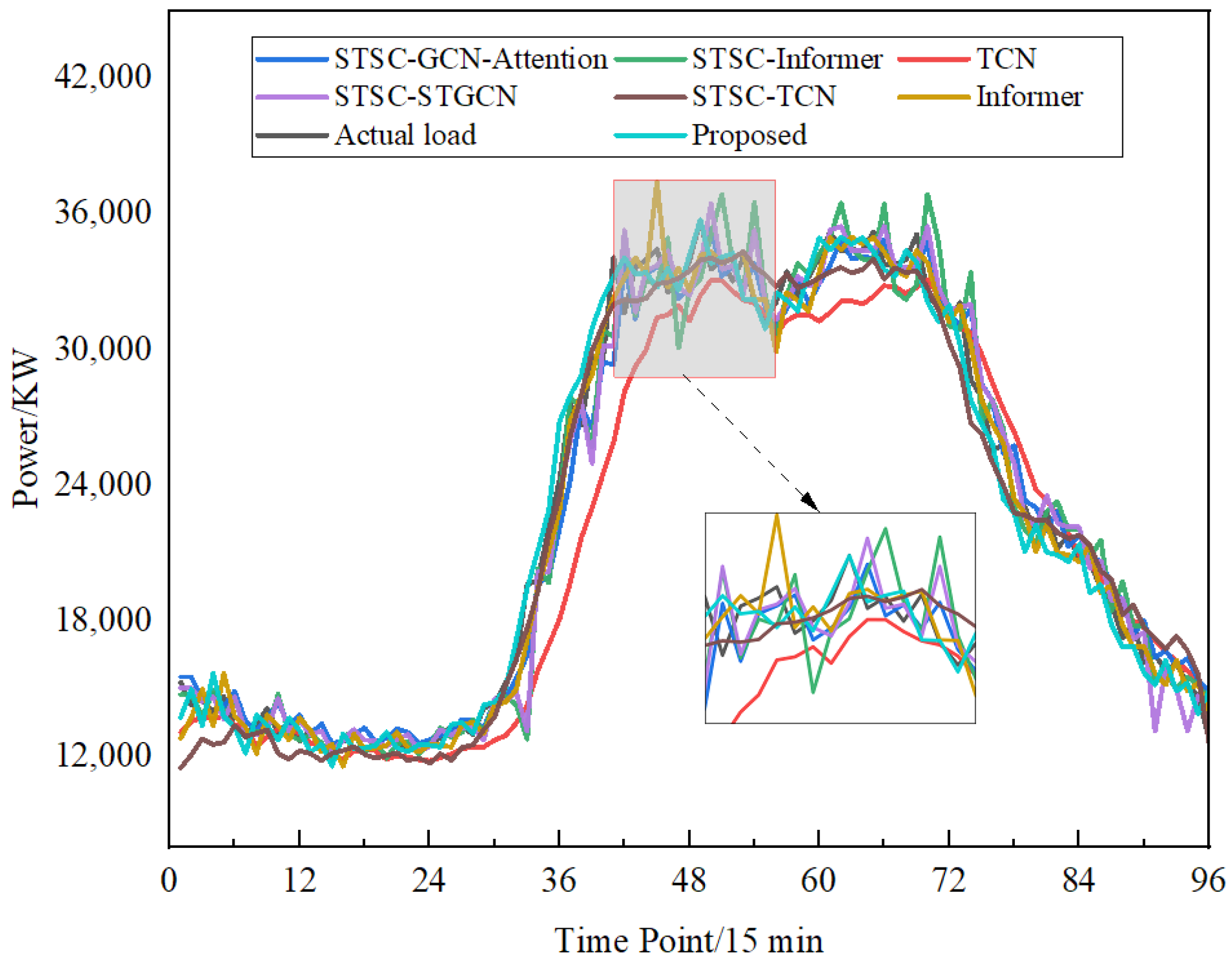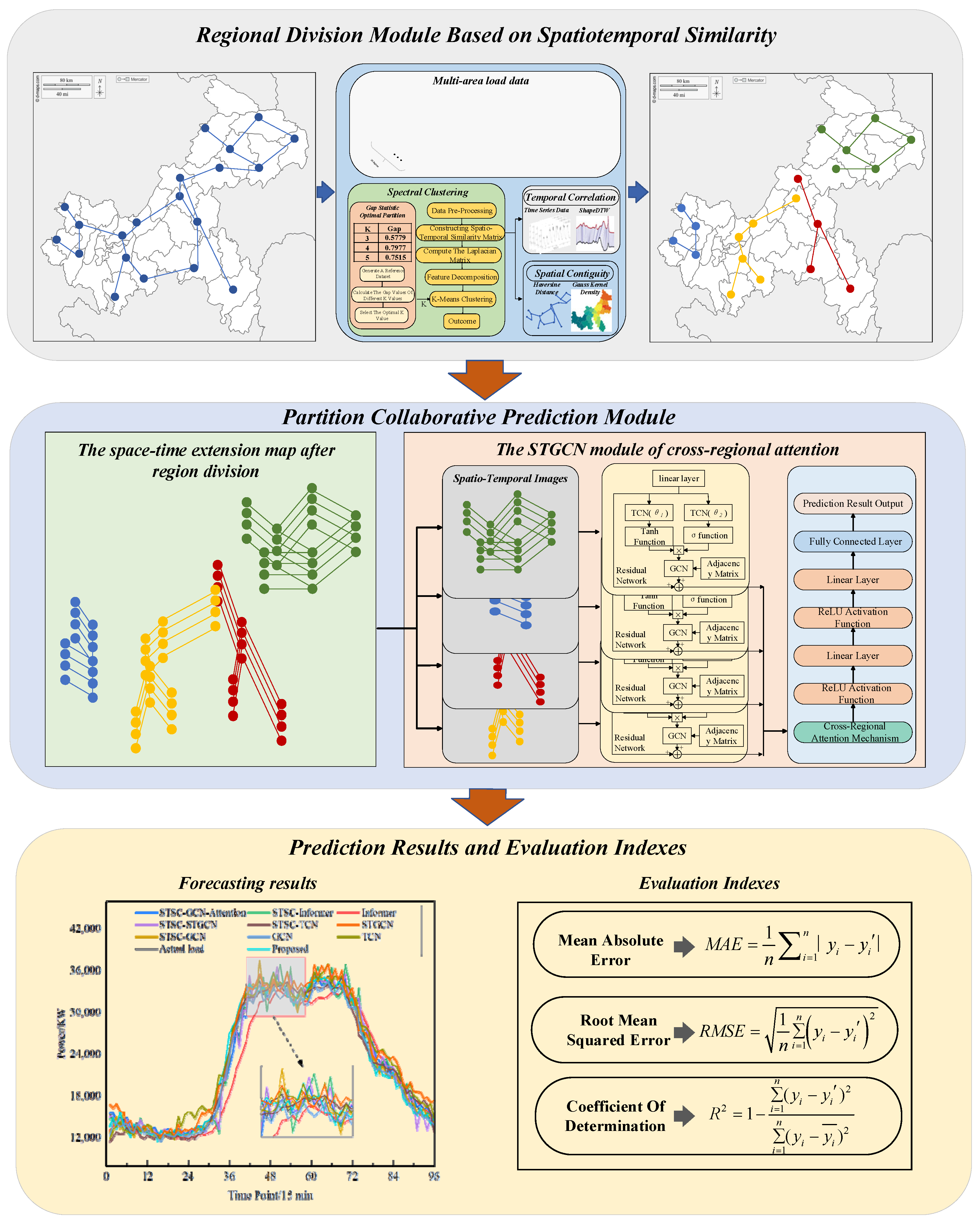 - A regional collaborative forecasting method based on STGCN is constructed. A local STGCN is deployed in each sub-region to precisely extract intra-regional features. The cross-regional attention mechanism is then designed to achieve collaborative fusion of global information. By balancing the adaptability of regional models with the interaction of global features, the proposed method effectively improves the overall accuracy and stability of short-term load forecasting for multi-node systems.