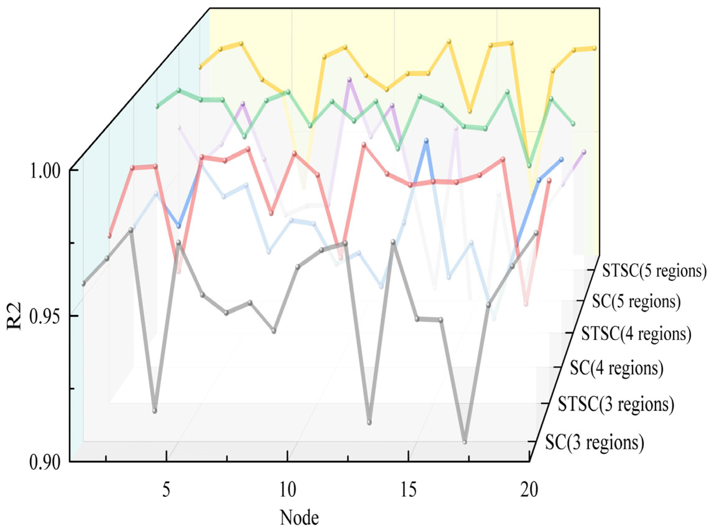 - An integrated similarity matrix is constructed by combining the temporal correlation matrix based on ShapeDTW and the spatial proximity matrix, which, together with spectral clustering and Gap Statistic for adaptive determination of the optimal number of partitions, enables the division of load nodes into multiple sub-regions with high spatiotemporal similarity. This approach transforms a single complex graph structure into several simpler ones, effectively reducing graph complexity while enhancing regional homogeneity. Comparative ablation experiments validate the effectiveness of the method. The spectral clustering model based on the spatiotemporal partitioning strategy achieves an average improvement of 3.142% in the R2 metric across 20 nodes compared to the traditional spectral clustering model.