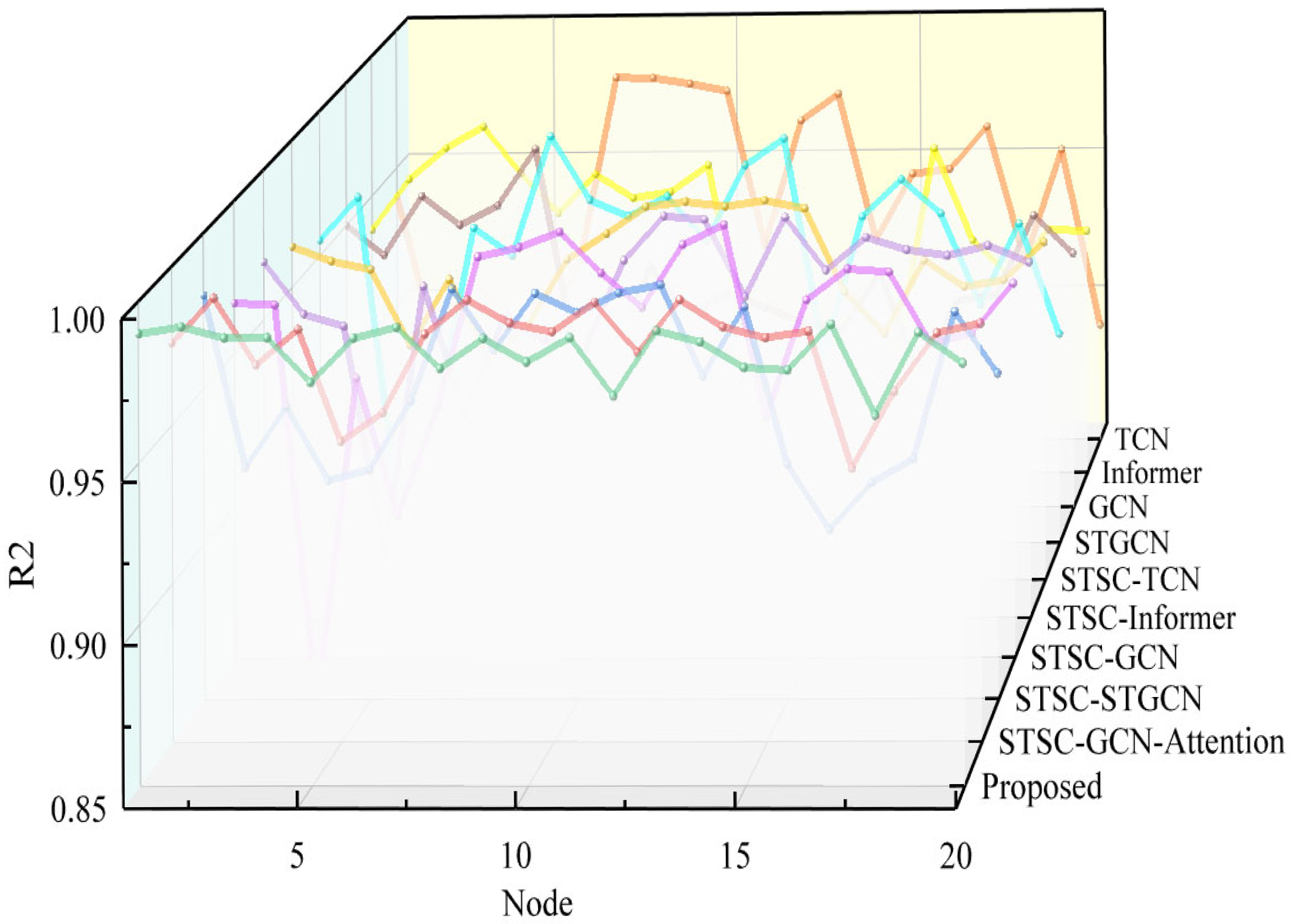 - The synergistic effect of partitioned STGCN and cross-region attention mechanisms effectively addresses the issue of “information islands” and insufficient inter-regional dependencies, significantly improving both prediction accuracy and stability. Verified through comparative ablation experiments, the proposed method achieves an average improvement of 3.563% in the R2 metric across 20 nodes compared to traditional models. The proposed model demonstrates high balance and stability, with an R2 distribution range of [0.9635, 0.9920] and a standard deviation only one-fourth that of the traditional STGCN model. The regional partitioning strategy effectively mitigates the negative impact of complex graph structures on local prediction accuracy, while the cross-region attention module suppresses error propagation across regions, ensuring balanced and stable prediction performance across all nodes.