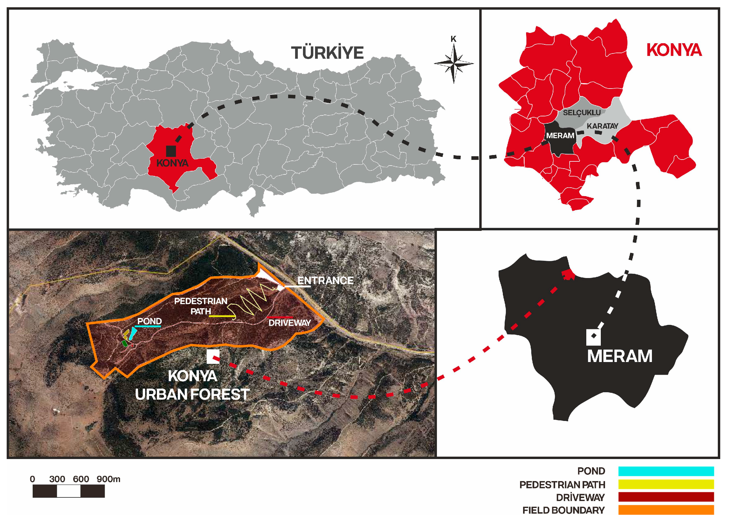 This study was conducted in the Konya Urban Forest, located within the boundaries of Meram district in Konya, the sixth most populous city in Türkiye. With a population of approximately 348,000, Meram occupies a strategic position in meeting the city’s overall need for green space.