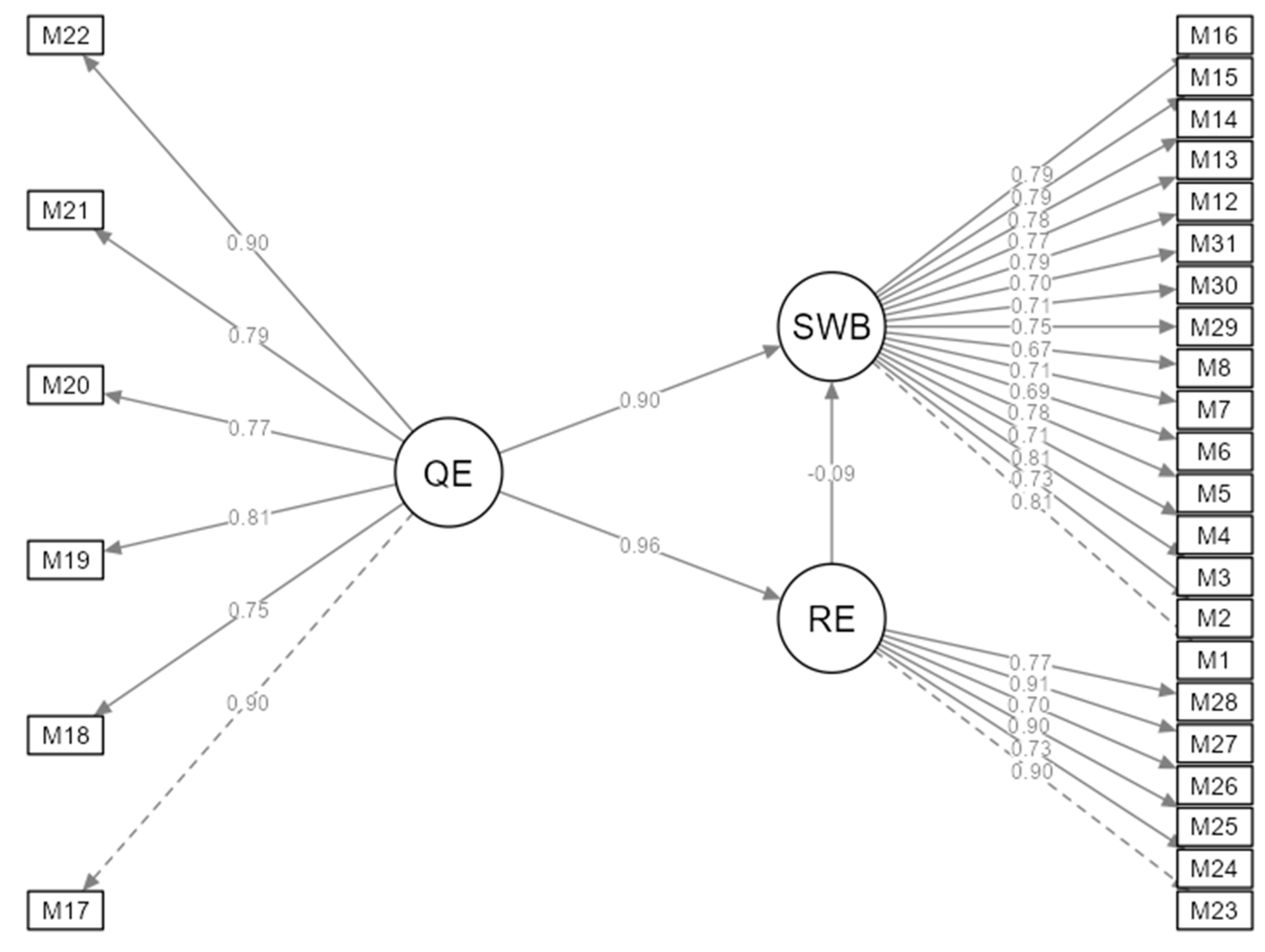The findings of the structural equation model reveal that QE significantly predicts both RE and SWB. RE also has a significant positive effect on SWB. Furthermore, the results indicate that RE partially mediates the relationship between QE and SWB. All hypothesized paths were found to be statistically significant and thus supported (