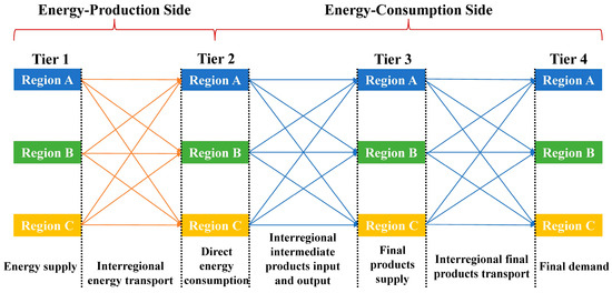 This study extends the single-region, national-level energy–economic system model into a multi-regional context, as illustrated in Figure 1. The core innovation lies in expanding the MRIO model beyond the energy-consumption side to also encompass the energy-production side. This is achieved by integrating the direct energy consumption of end-use sectors with sector-specific energy structures, while simultaneously tracing the regional origins of these energy inputs. The framework categorizes regions into four hierarchical tiers: Tier 1 (energy supply), Tier 2 (direct energy consumption), Tier 3 (final products supply), and Tier 4 (final demand). This model works as follows: on the energy-production side, energy produced in Tier 1 regions is transported to Tier 2 regions via inter-regional energy trade. On the energy-consumption side, in Tier 2 regions, the energy is directly consumed by end-use sectors to produce intermediate products. Those intermediate products are then processed into the final products output in Tier 3 regions through inter-regional economic input and output activities. Finally, final products are transported to Tier 4 regions to meet their final demand, including consumption and investment or export to foreign regions. ERCERs are represented as carbon sources in Tier 1 regions, direct carbon emissions in Tier 2 regions, and emission responsibilities in Tier 3 and Tier 4 regions. And they are transmitted through energy and economic products transport, from left to right. To ensure both completeness and realism of the energy supply chain, this study considers the international energy trades in the link between Tier 1 and Tier 2 and ERCERs embodied in import products.