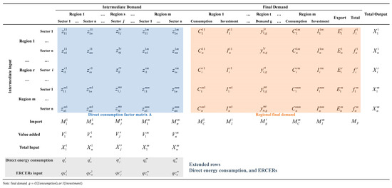 After establishing the framework model, there are two main steps of the EA-MRIO method for quantifying ERCERs. First, by extending the row of direct energy consumption and ERCERs of end-use sectors in Tier 2 regions, the EE-MRIO model is employed to formulate the equations tracking ERCER flows on the energy-consumption side. Then, EAA is used to trace the regional energy sources (Tier 1 region) of energy consumed in the Tier 2 region.